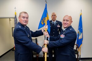 Colonel Douglas E. Gullion, 459th Air Refueling Wing commander (left), hands the 459th Operations Support Squadron guidon to Lt. Col. Brian J. Fisher (right) in a hangar on the Joint Base Andrews, Maryland, flight line Oct. 13, 2018. Fisher previously served as the 459th OSS director of operations