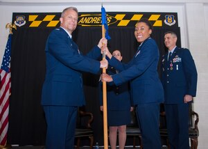 Major Danah Autry (right) takes the 459th Maintenance Squadron guidon from Col. Roger Law, 459th Maintenance Group commander (left), during a change of command ceremony at the 459th Air Refueling Wing, Joint Base Andrews, Md., May 5, 2018. Lt. Col. Kenneth Jensen is the outgoing 459 MXS commander.