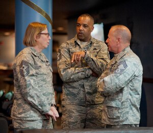 Chief Master Sgt. Timothy White Jr., Fourth Air Force command chief, March Air Reserve Base, Calif., converses with Chief Master Sgt. Vicky Kuntz, 459th Air Refueling Wing command chief, and Chief Keith Cockey, 69th Arial Port Squadron chief enlisted manager, while participating in a friendly game