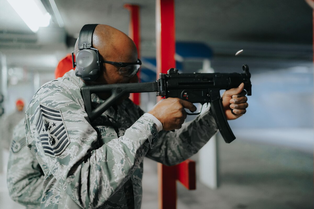 Chief Master Sgt. of the Air Force Kaleth O. Wright shoots an MP5 submachine gun at the firing range at Joint Base Andrews, Md., March 14, 2017. Wright’s visit afforded him the opportunity to learn from and interact with Airmen of the 11th Security Support Squadron. (U.S. Air Force photo by Senior Airman Delano Scott)