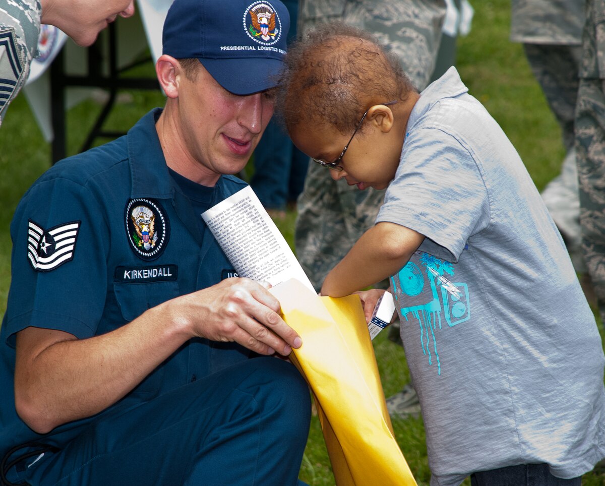 JOINT BASE ANDREWS, Md. -- Brandon Leach, eight, Pilot for a Day alum, sits on his mother, Suzie's knee, while being interviewed by a television reporter, at the Joint Service Open House here May 20. The 201st Airlift Wing, the 113th Wing and the 459th Air Refueling Wing sponsored a Pilot for a Day 2011 reunion during the JSOH. The Pilot for a Day program offers children serious illnesses a special day to be an Air Force pilot, giving them a break from whatever challenges they may face. (U.S. Air Force photo/ Staff Sgt. Sophia Piellusch)