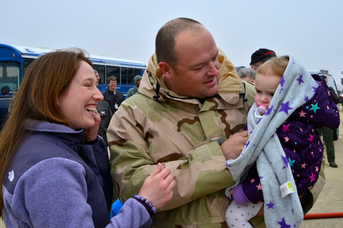 Megan McAlister and son Colin await husband and father, Tech. Sgt. Chris McAlister, 756th Air Refueling Squadron KC-135 Stratotanker boom operator, on the flightline at Joint Base Andrews, Md., Feb. 9, 2015. McAlister was deployed to the 379th Air Expeditionary Wing at an undisclosed location in southwest Asia. He was separated from his wife and eight-month-old son for two months. (U.S. Air Force photo/Airman 1st Class Philip Bryant)